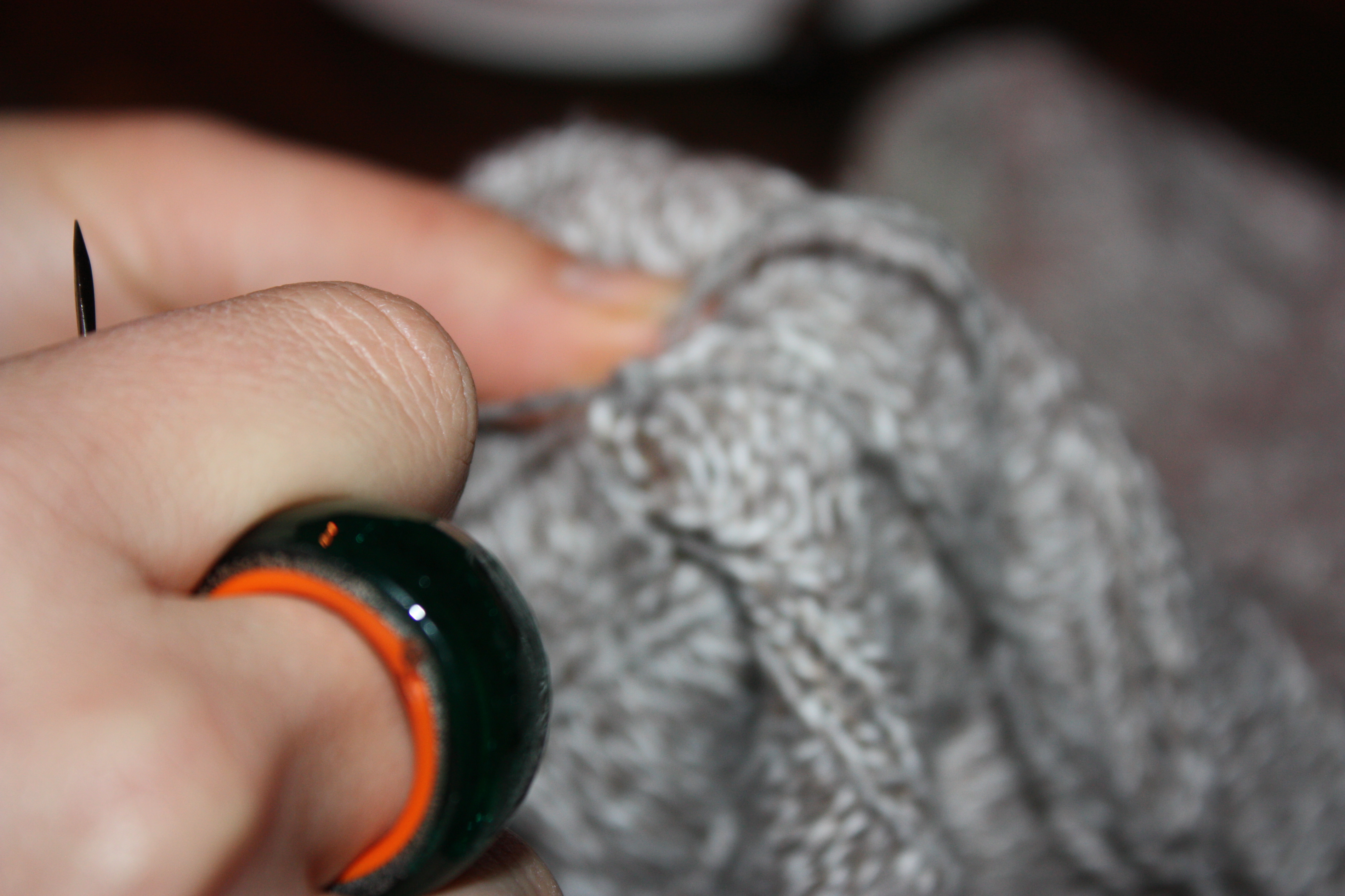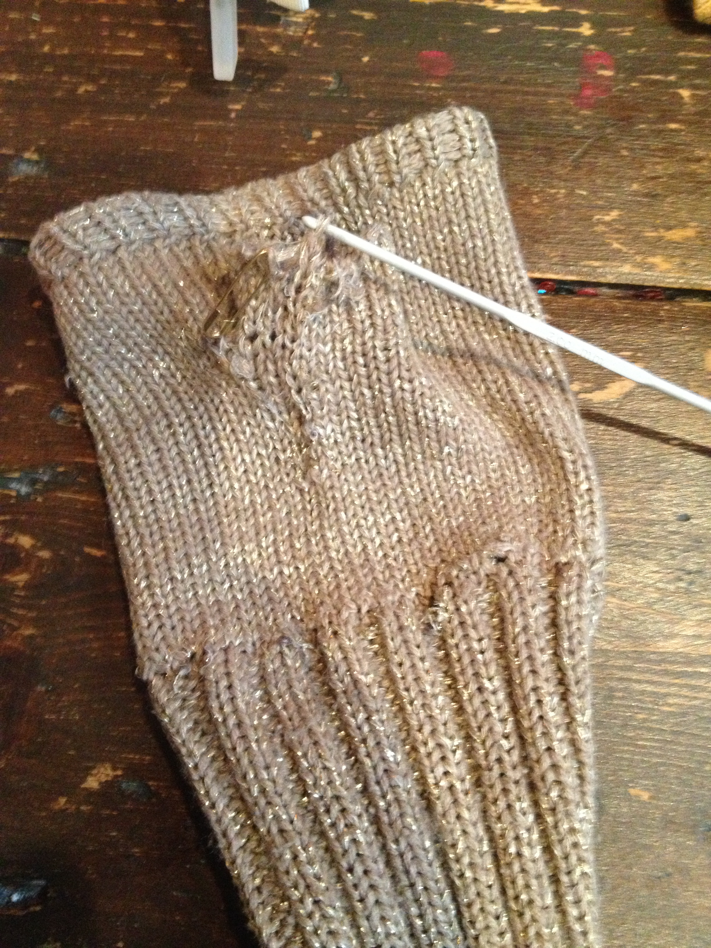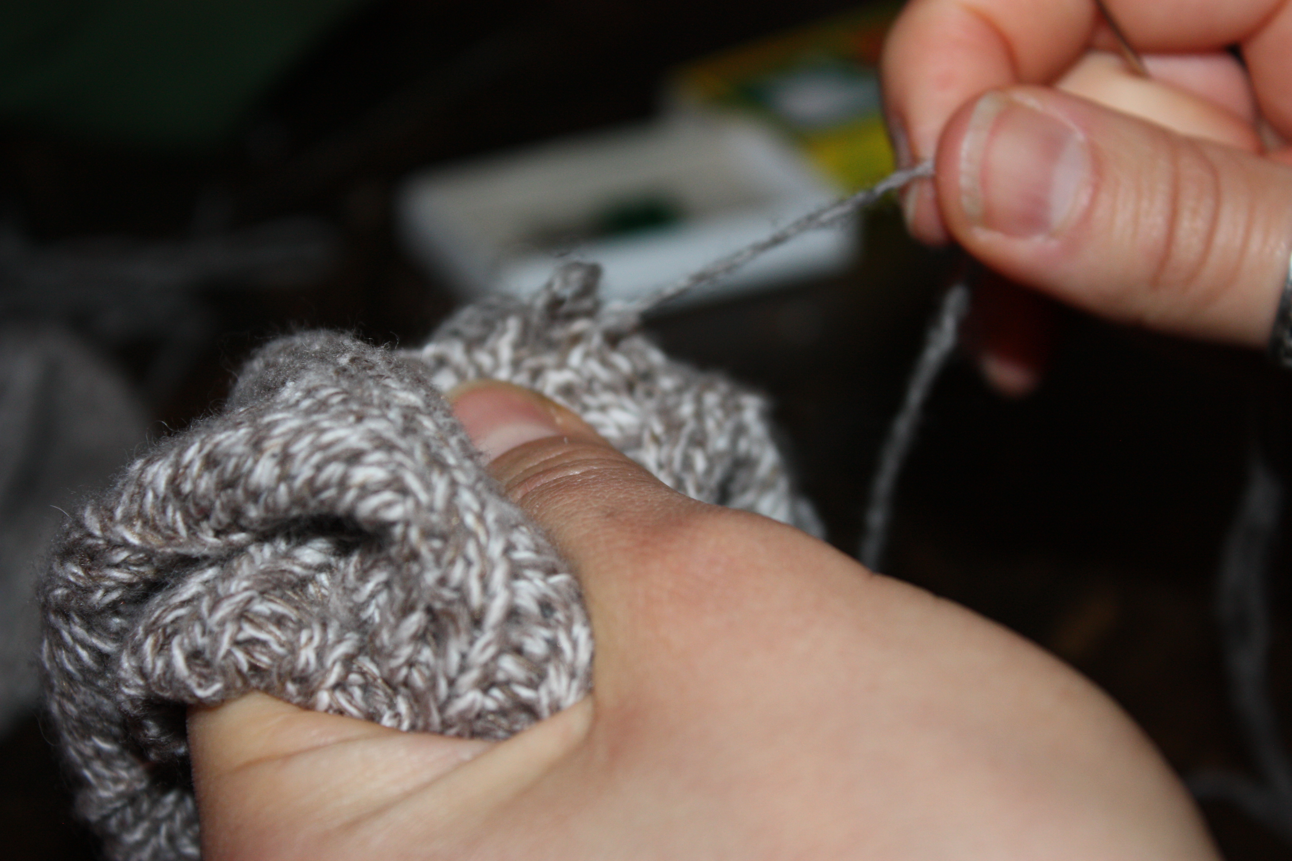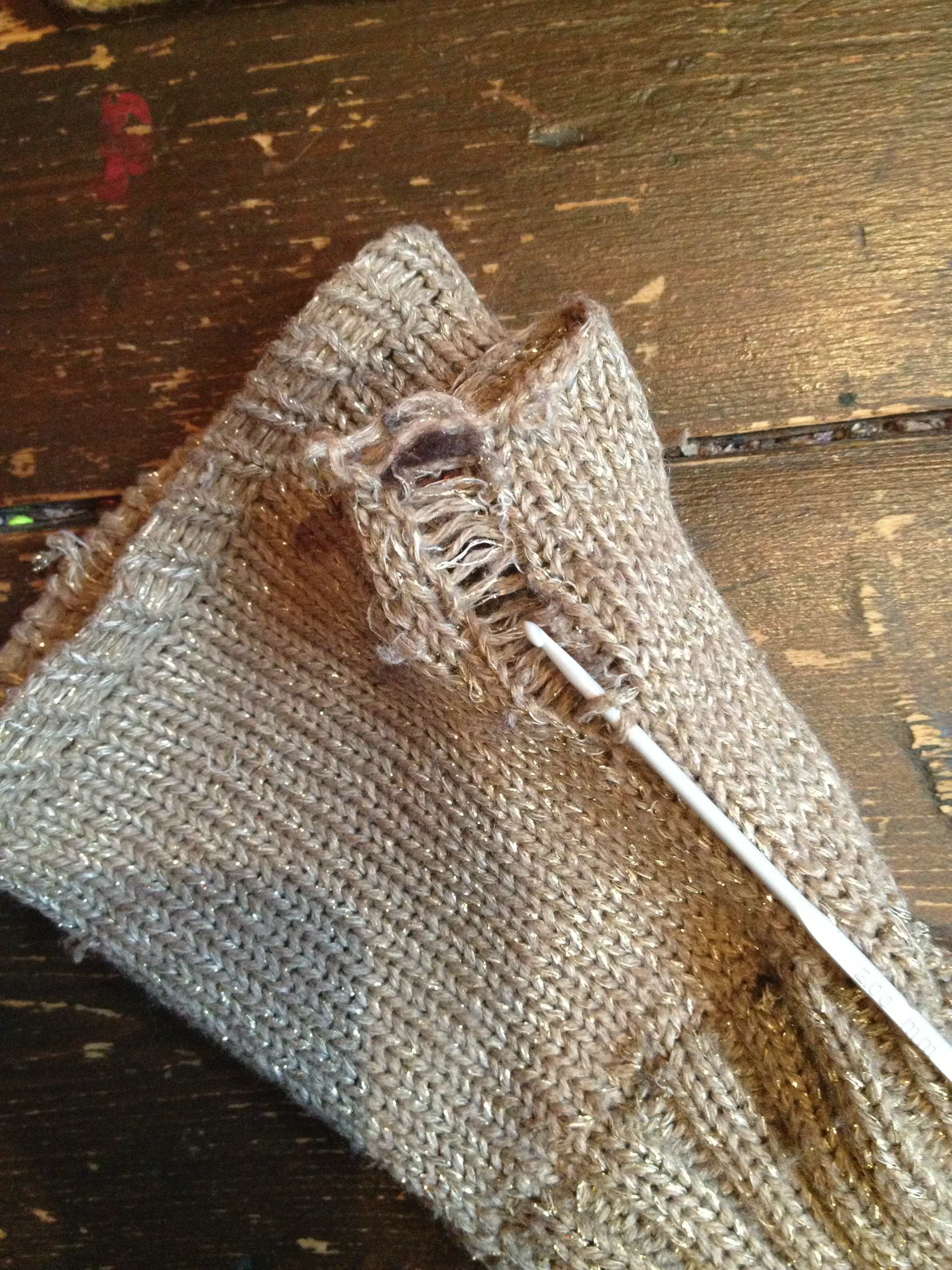 using a crochet hook to repair the ladder on the thumb