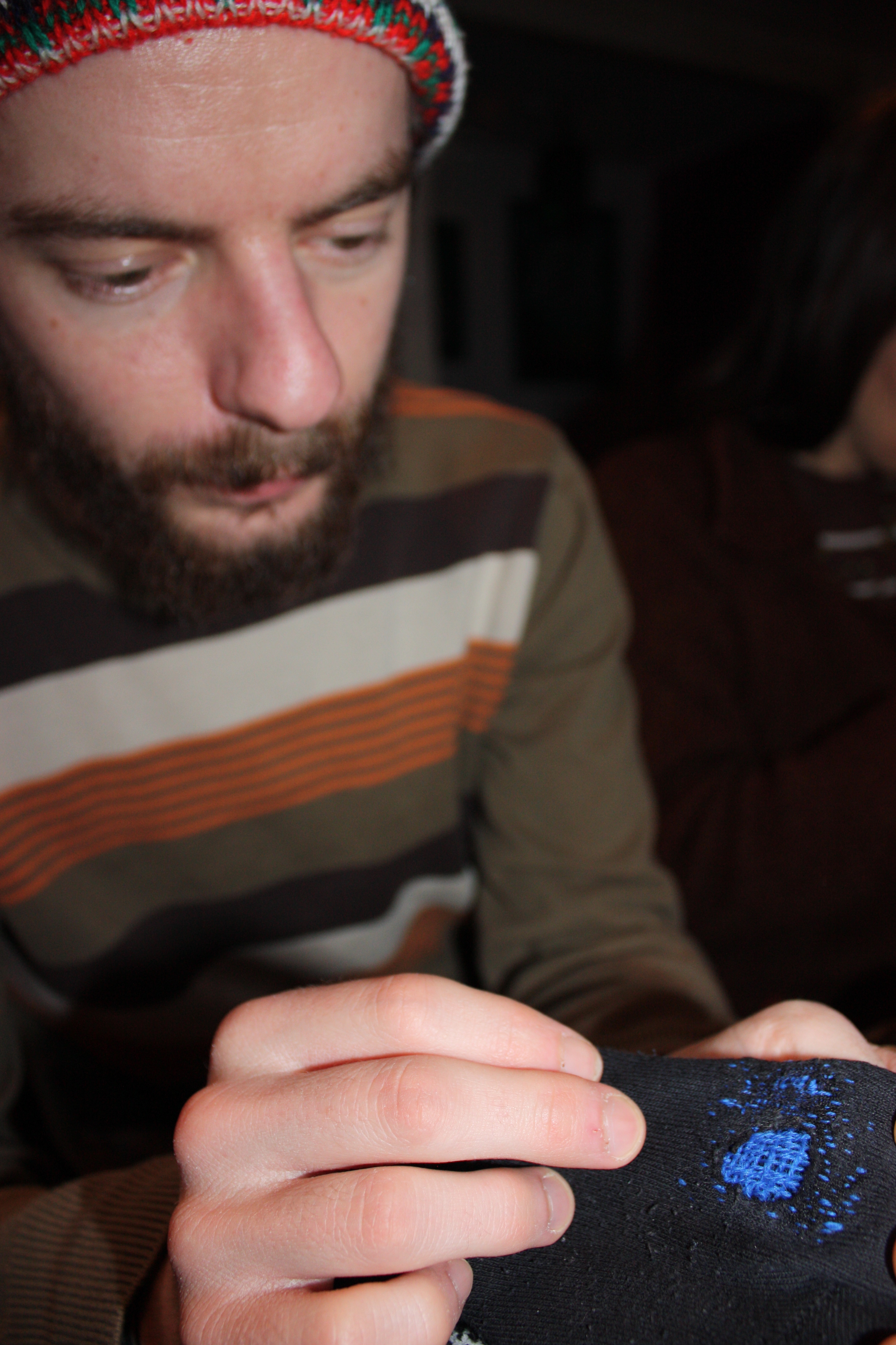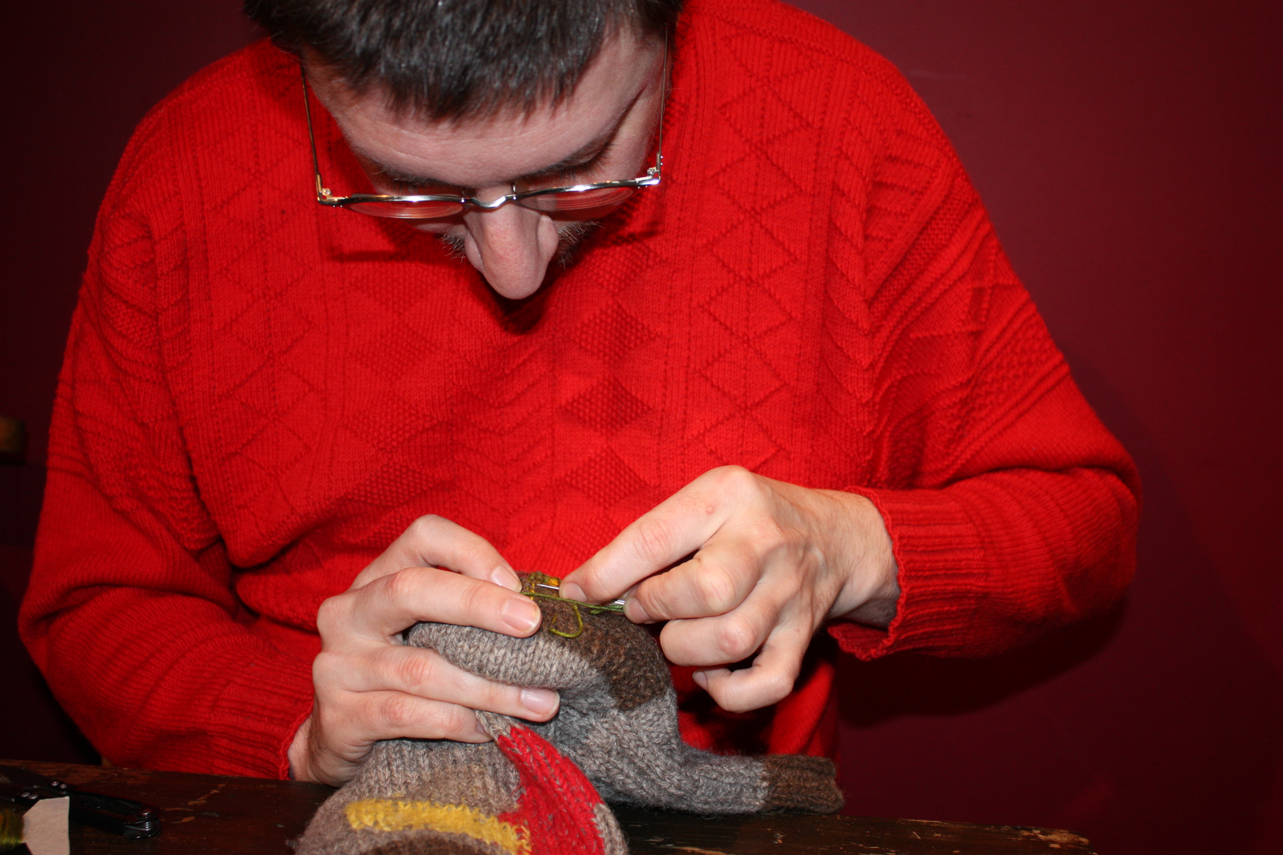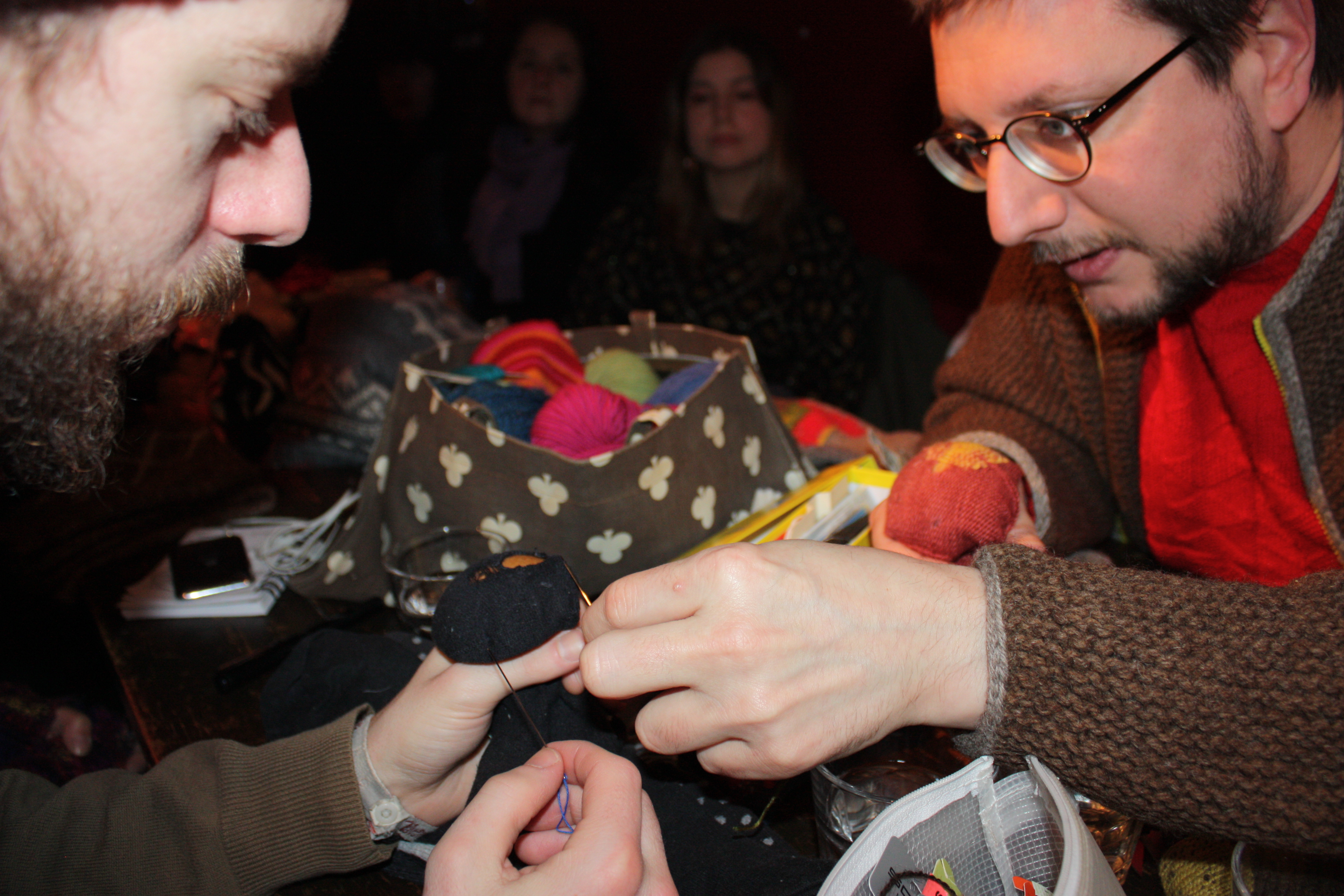 The talented Tom of Holland came bearing darning mushrooms, wool and needles and showed us how to use visible mending to repair our holey (not holy) clothes.
