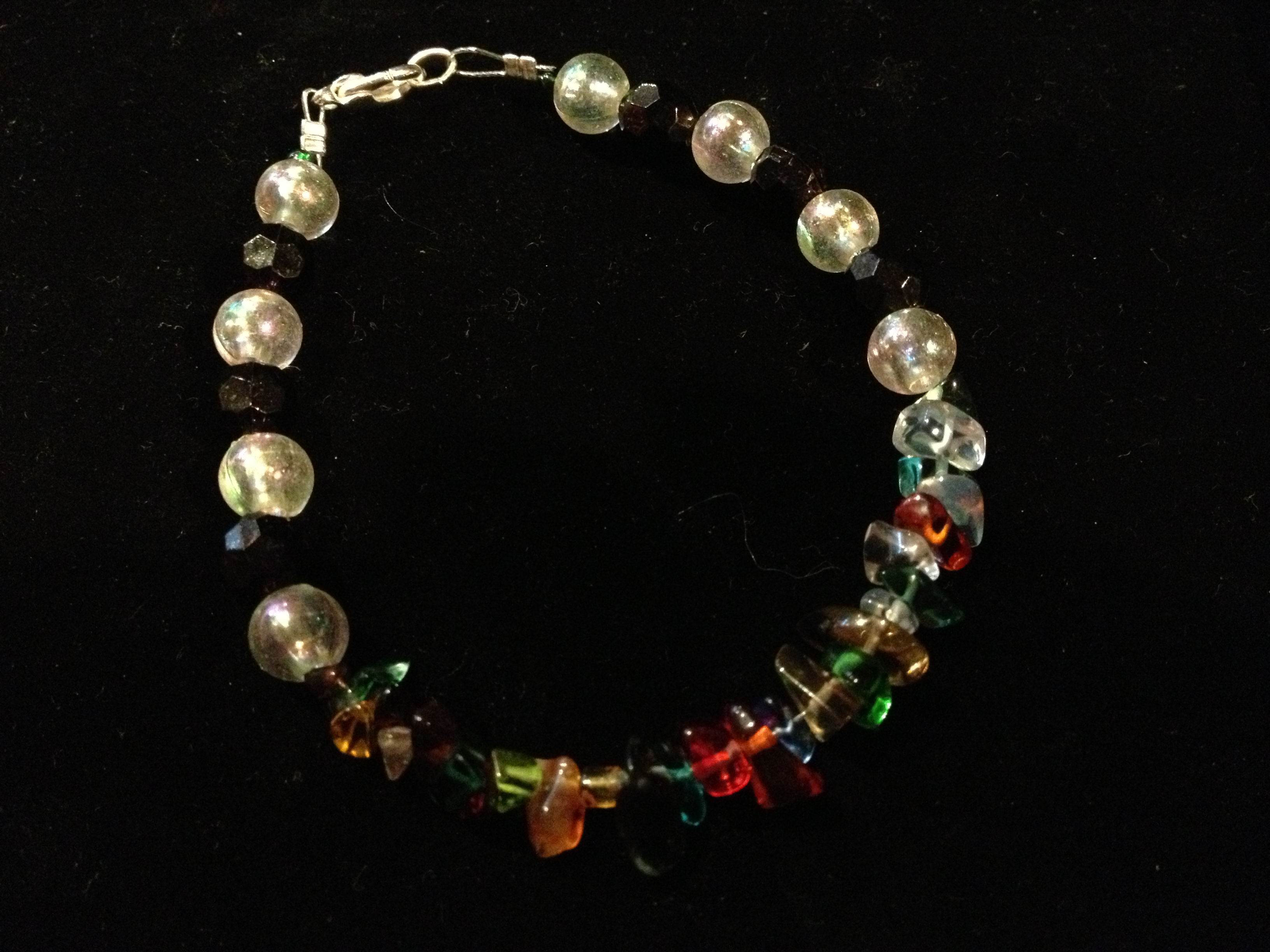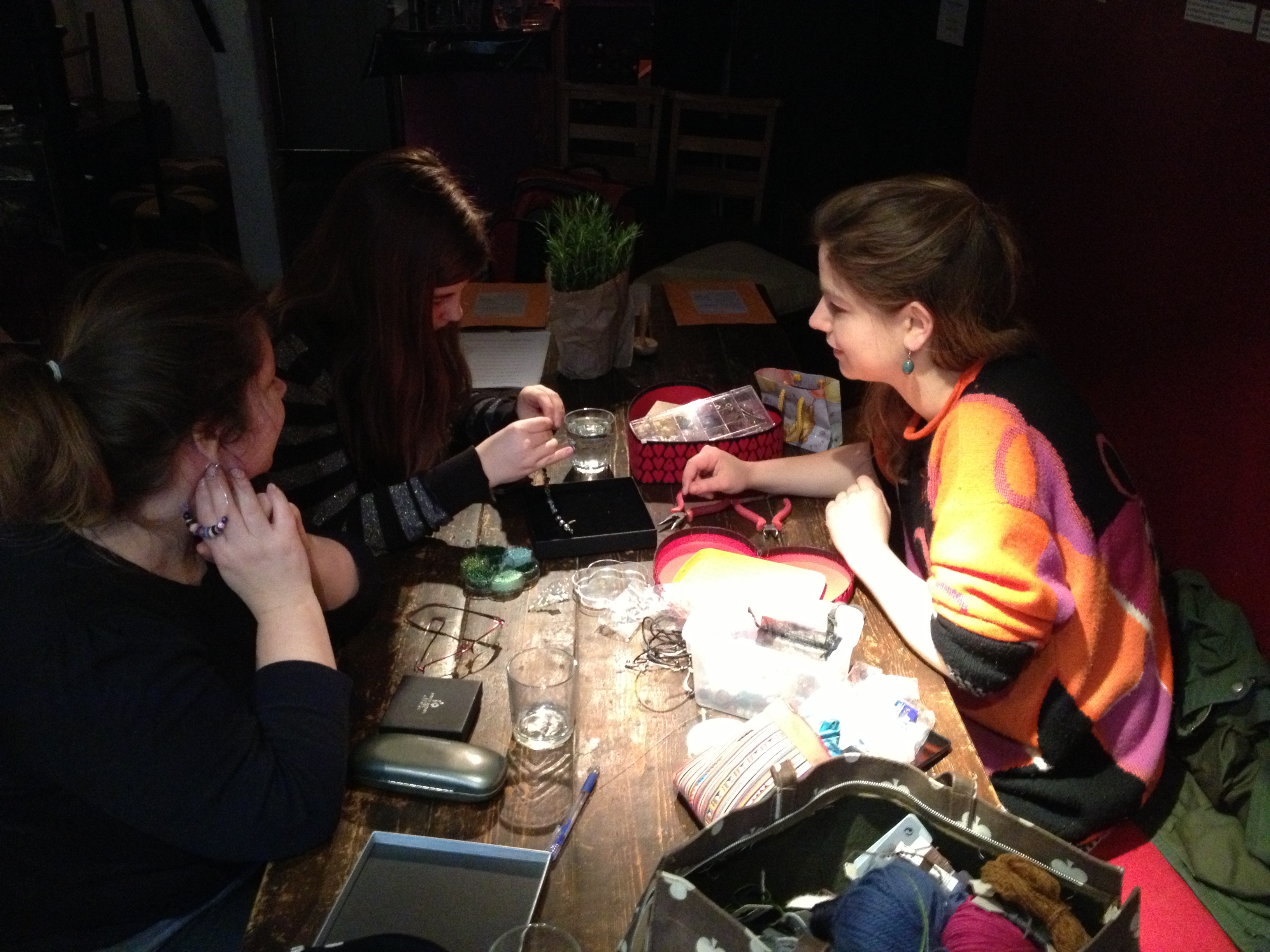 Helping Hannah add new beads in with the remains of a necklace which had exploded to create a lovely new bracelet.