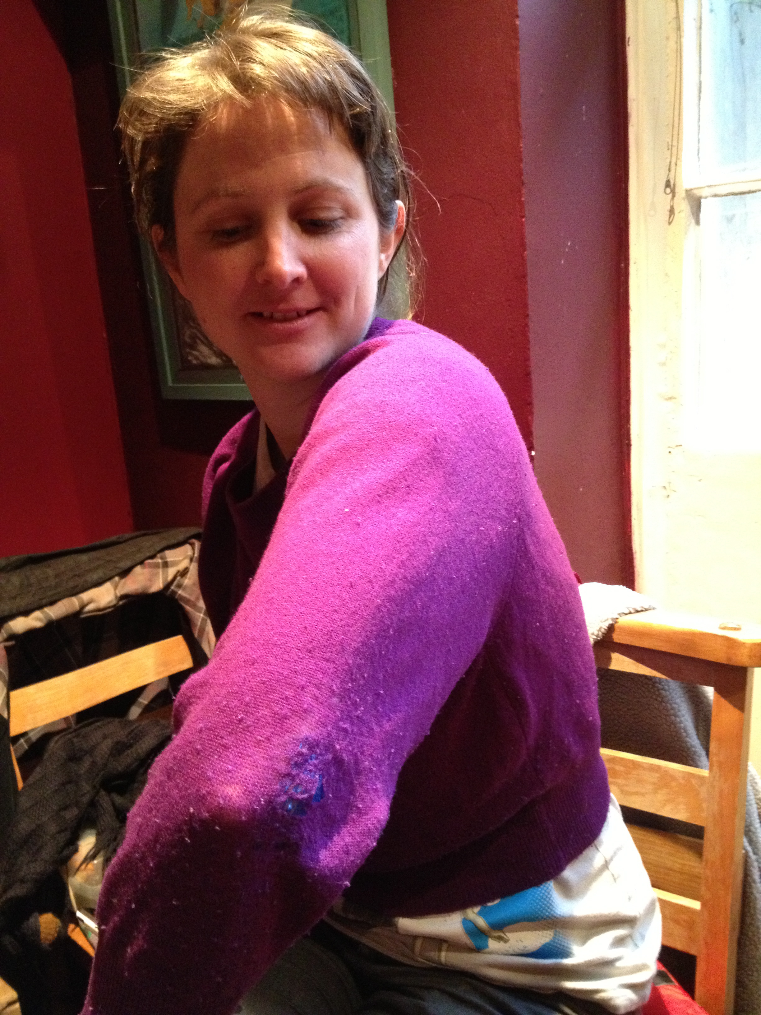 Irene repaired a moth hole with a lovely contrasting colour of thread