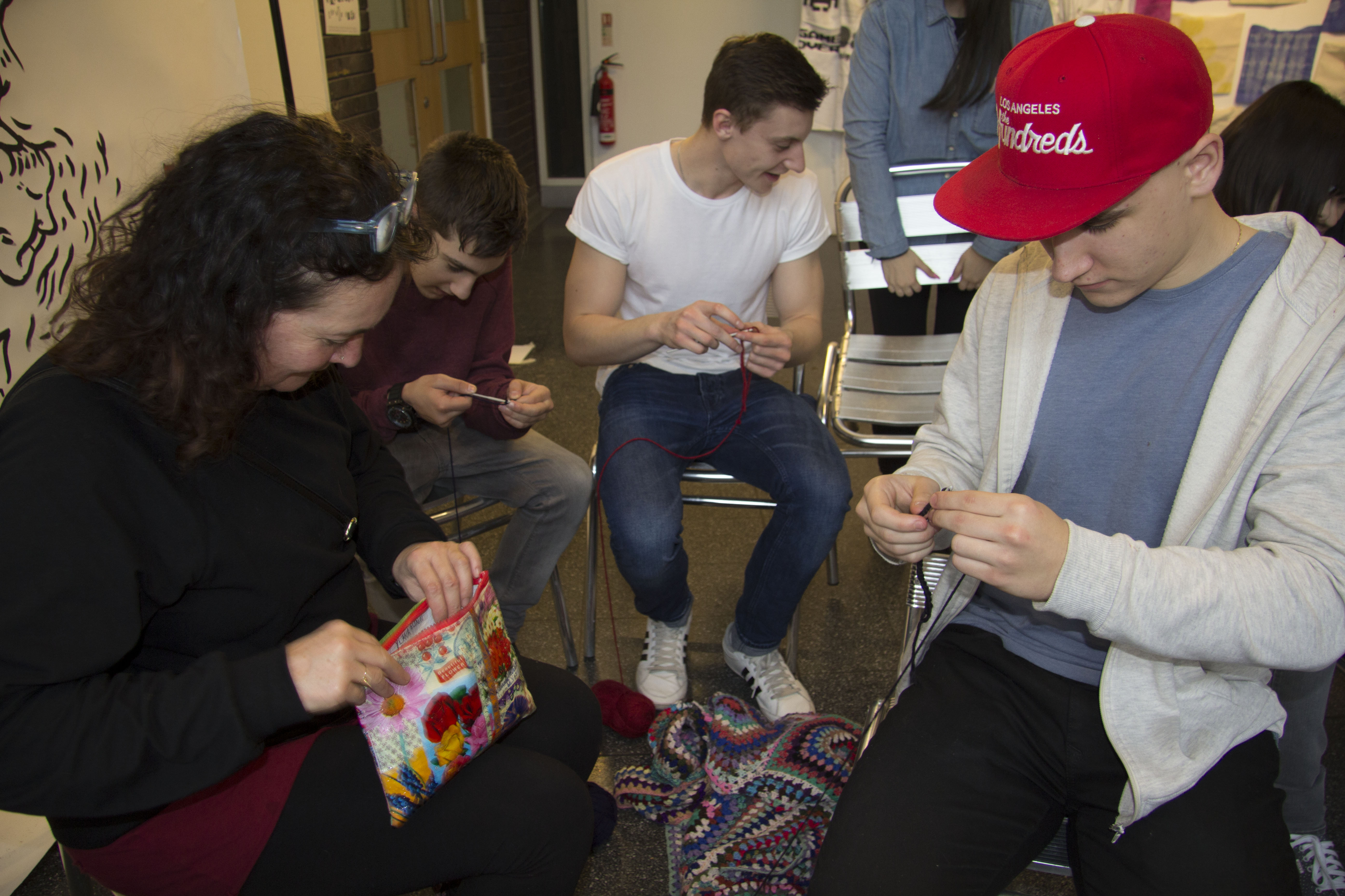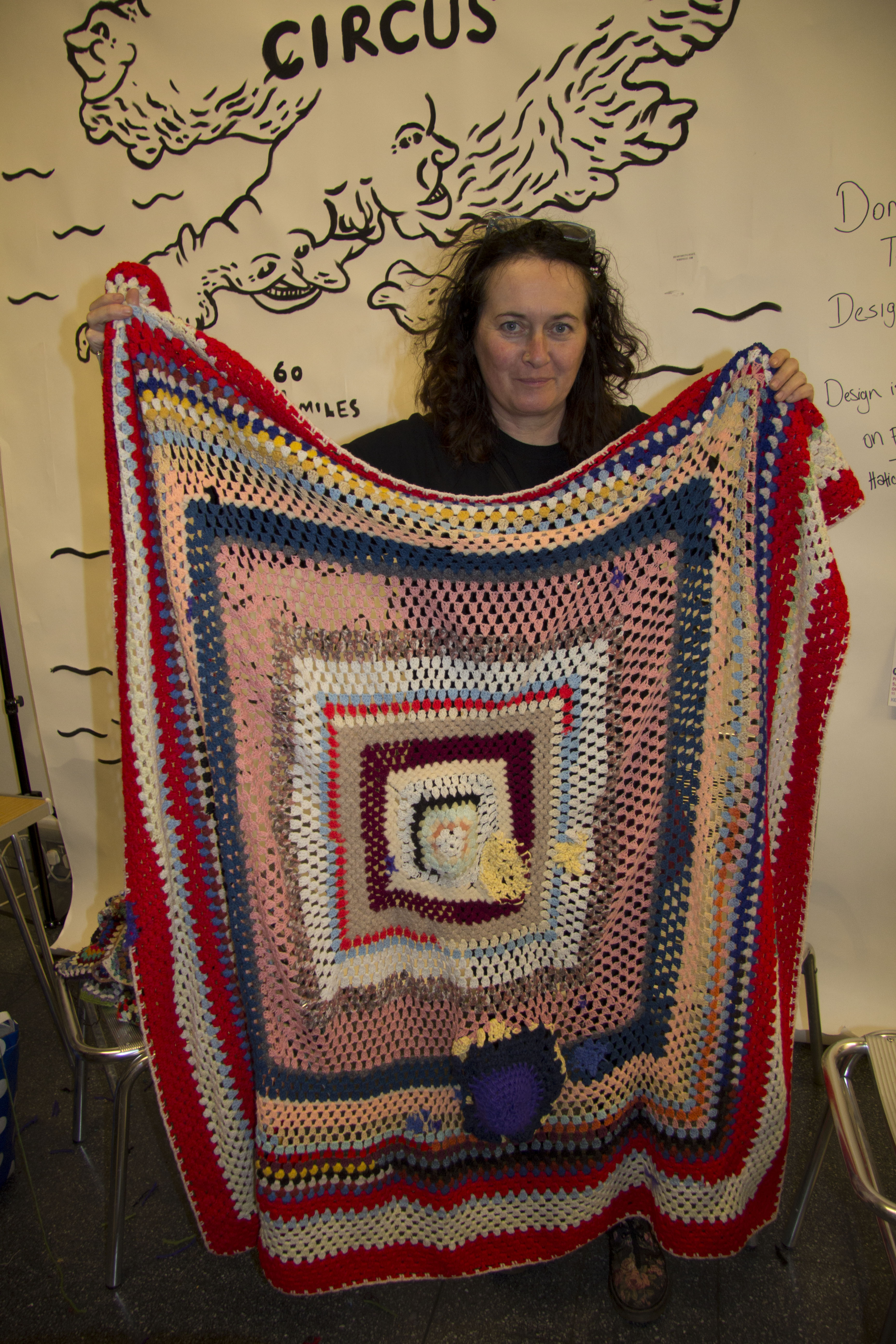 Christine taught Tom, Krzysz and Mark how to crochet and they helped her repair the blanket her dog had been munching on!