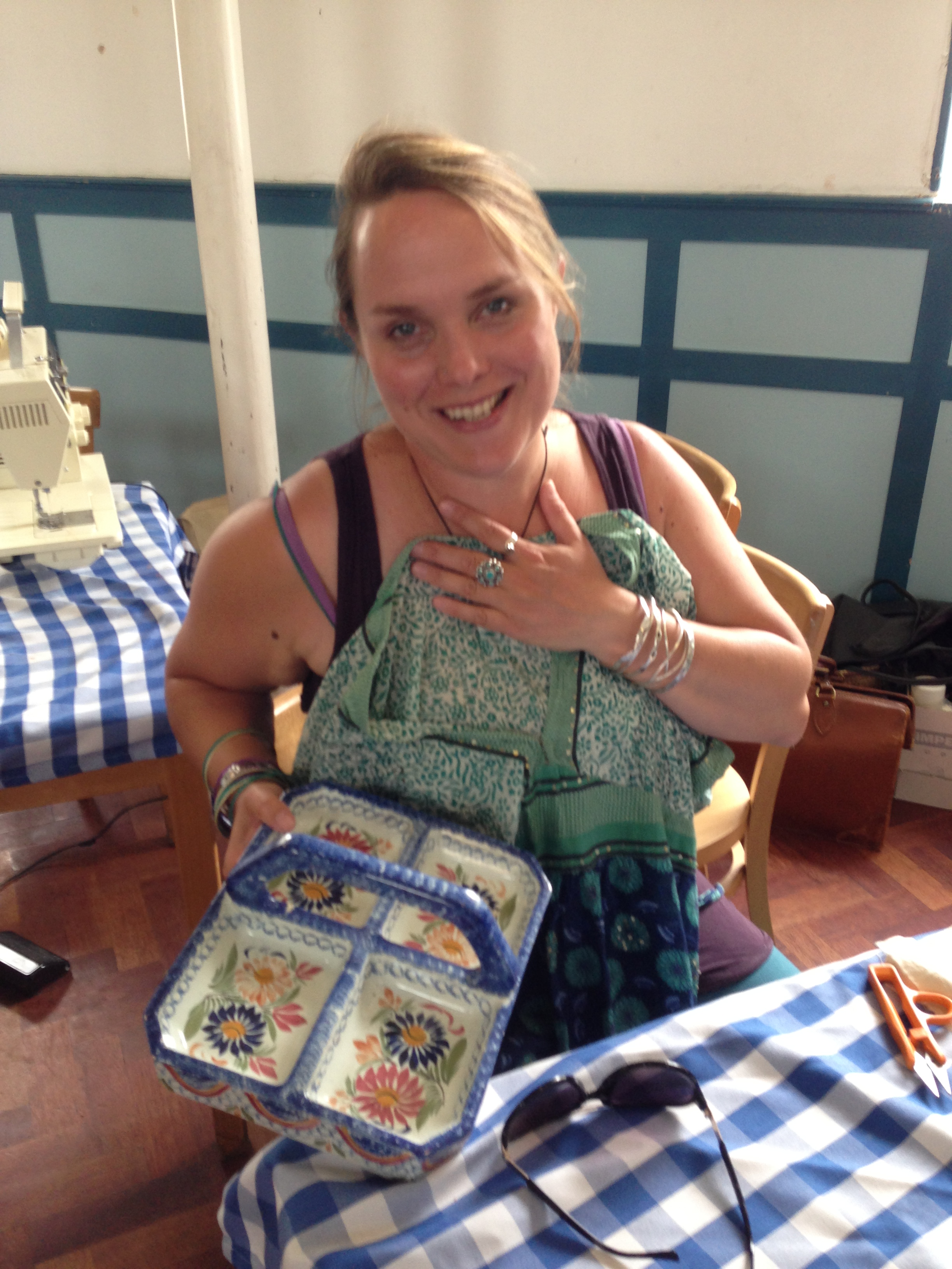 Hannah fixed both her top and a china tray,