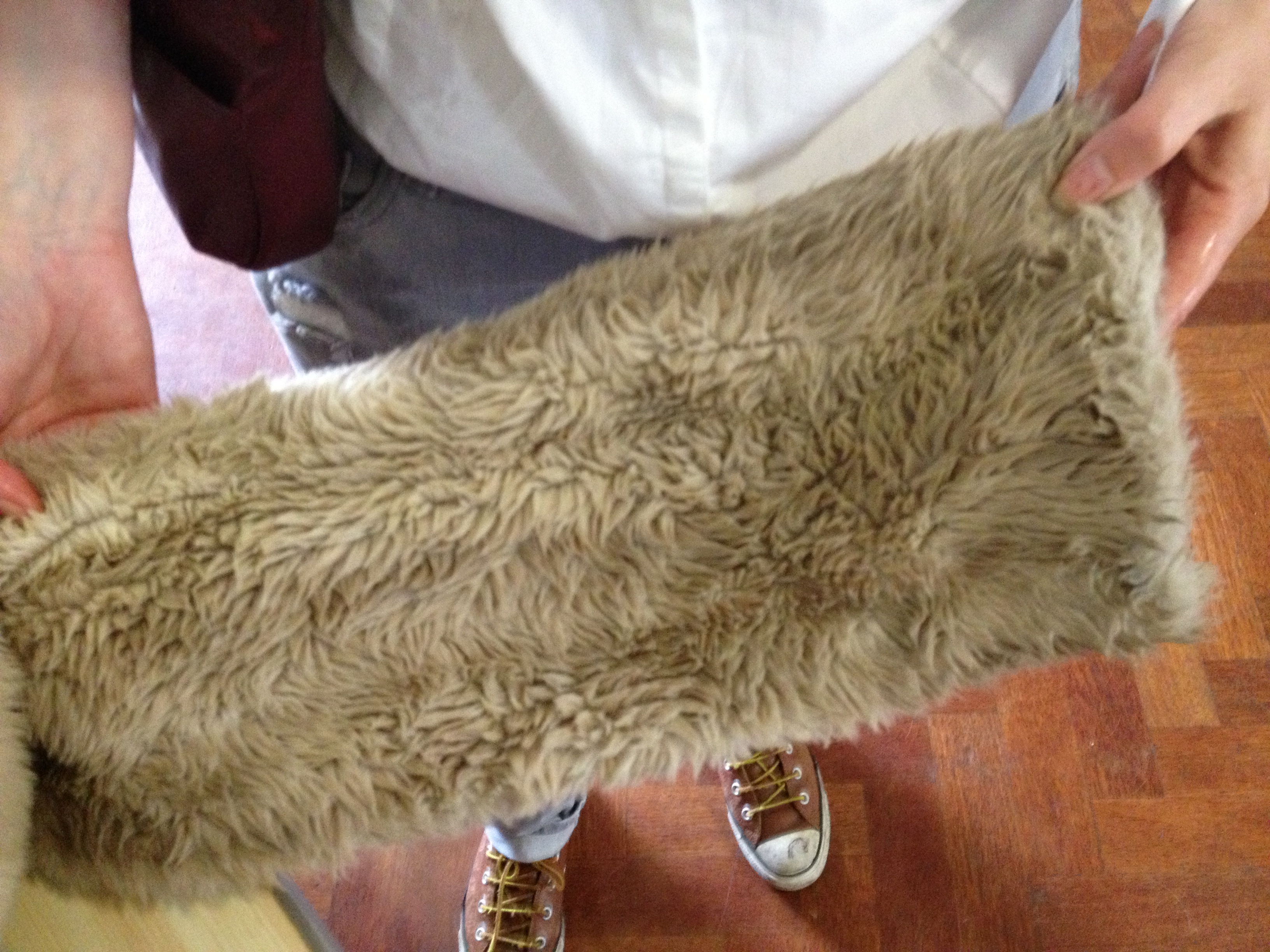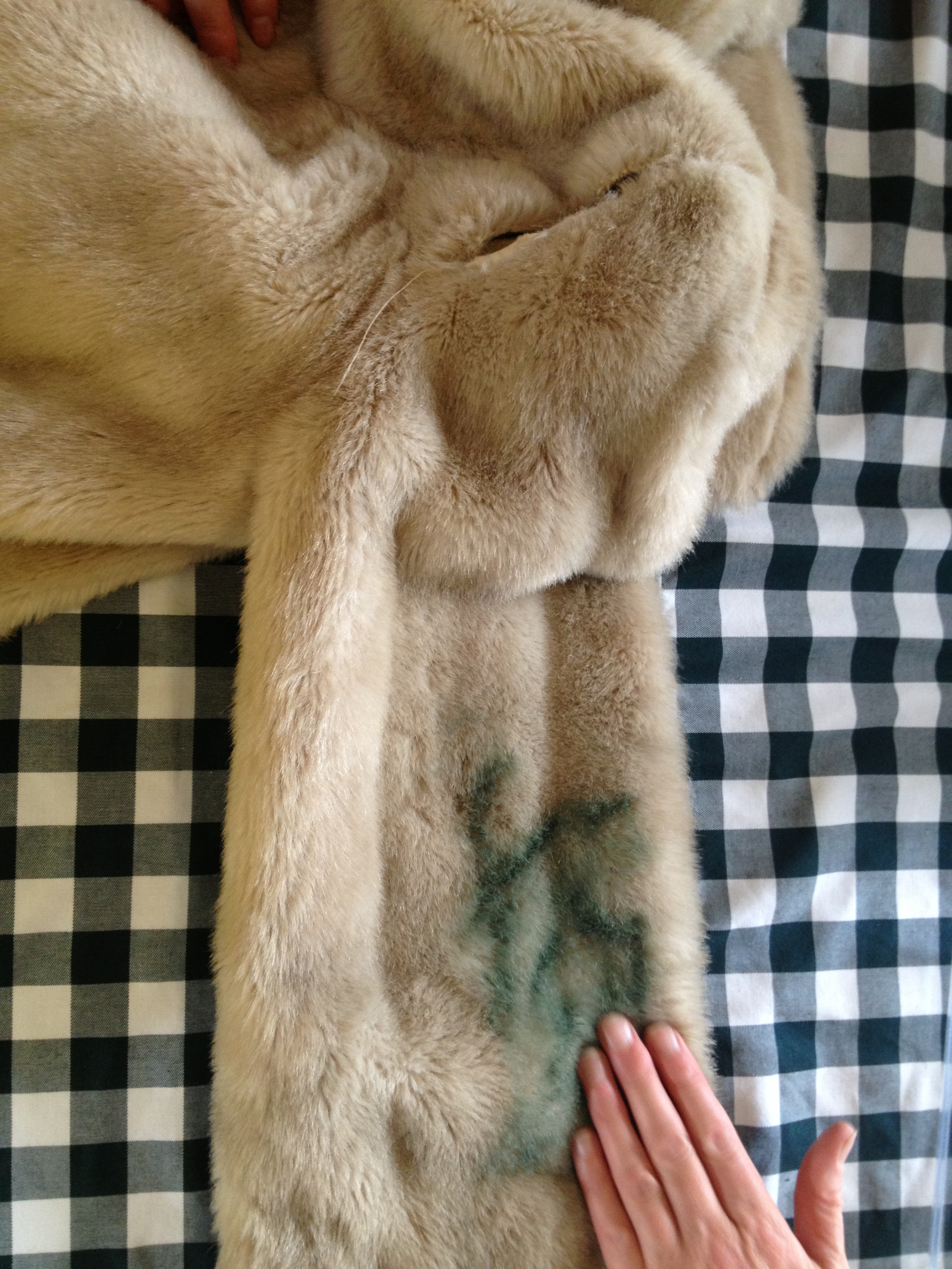Rachel brought in the faux fur coat she had borrowed from her sister.