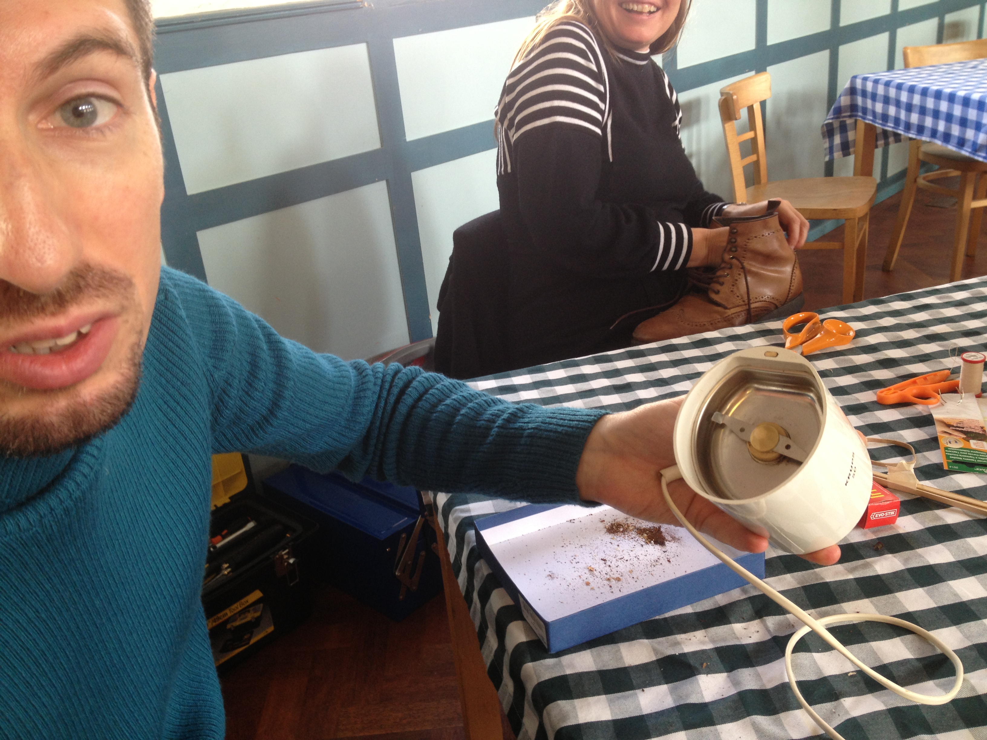 Mattia showed someone how to clean the points on their coffee grinder.