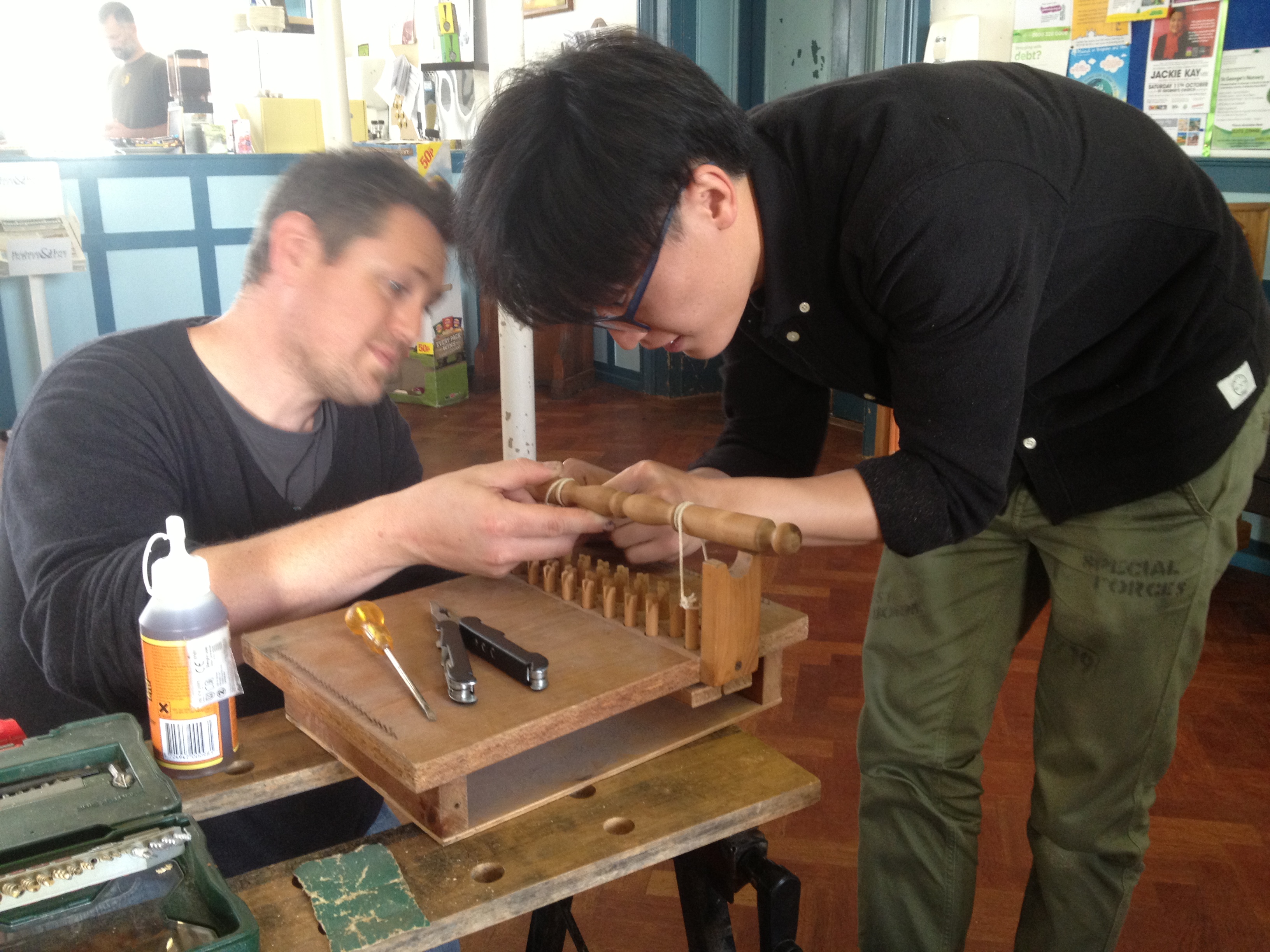 Felix and Dan got to work fixing a small loom which Ali had found in a skip.