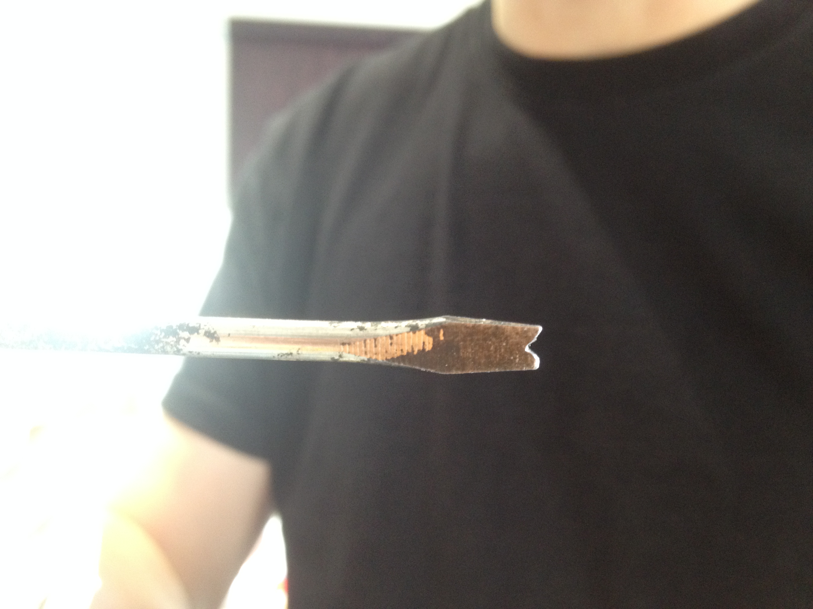 Tom had to adapt a flathead screwdriver to fit the unusual head.