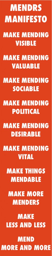 MENDRS aim to make mending visible, make mending political & make more menders. A research activist project by Jonnet Middleton, Beck Collins and Giuseppe Salvia. Their manifesto is as follows: